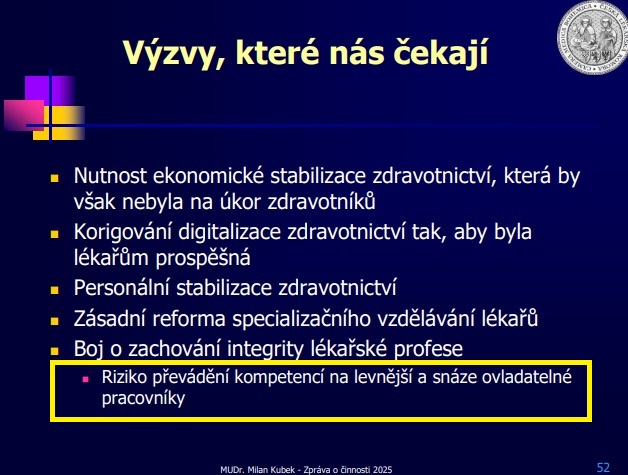 Česká asociace sester se důrazně vymezuje proti výroku prezidenta České lékařské komory MUDr. Milana Kubka, který hovořil o „riziku převádění kompetencí na levnější a snáze ovladatelné pracovníky“. Tento výrok považujeme za nepravdivý, znevažující a neodpovídající realitě současného zdravotnictví.